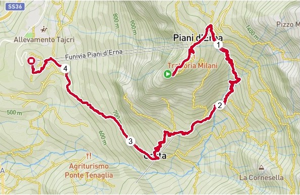 Camminata tutta in discesa utilizzando l'impianto di risalita della funivia dei Piani d'Erna che si prende in località Versasio (Lecco). Si arriva ai Piani d'Erna dove in 10 minuti si sale alla croce del Pizzo d'Erna (1.375 m.), punto molto panoramico. Da qui iniziamo la camminata ritornando nei pressi della cabinovia e scendendo fino alla Bocca d'Erna dove partono i vari sentieri del Resegone. Prendiamo quello in direzione S che scende nel bosco passando da Piazzolo della Valle, poi dalla Sorgente Spreafico, da qui in direzione SW fino a Valle Comera, Palazzetto, Sorgente del Kopp e arrivando al Rif. Stoppani (890 m.) in 2 h. di camminata tranquilla. Si prosegue la discesa sempre verso S fino ad arrivare alla frazione Costa dove parte la mulattiera principale in direzione NW che riporta al parcheggio a valle della funivia, dove si arriva in circa 1 h. La distanza non è lunghissima ma il dislivello in discesa è di circa 1.000 m. e circa 200 m. di salita considerando la salita iniziale alla croce e una leggera salita alla fine dell'escursione per ritornare al piazzale del parcheggio ... Massimo risultato con minimo sforzo. Lorella, Emilio QDR
