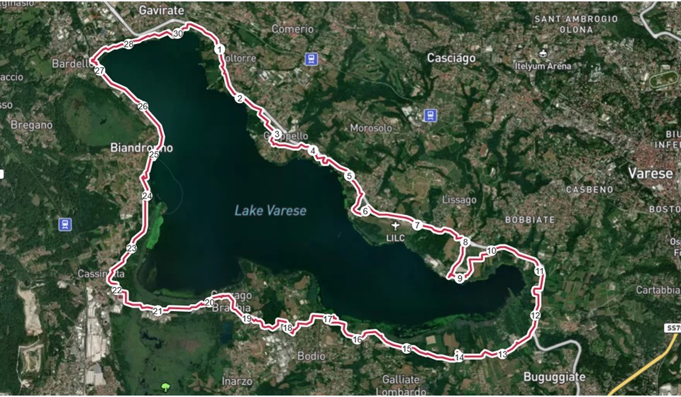 Partenza da Corgeno, comodo parcheggio in riva al lago di Comabbio, si prende la pista ciclo-pedonale del lago di Comabbio in direzione N fino ad arrivare all'inizio di Varano Borghi: da qui parte il raccordo per il lago di Varese e si arriva a Cassinetta dopo 7 km. Qui inizia il giro del lago di Varese (in senso orario nel nostro caso), si passa da Biandronno (km 9), Bardello (km 12), Gavirate (km 13), Voltorre (km 15), Oltrona al lago (km 16), Groppello (km 17), Calcinate del Pesce (km 19), lido di Schiranna (km 22), si passa nei pressi di Capolago (km 25,5), lido di Bodio (km 30), Cazzago Brabbia (km 32,5), si arriva a concludere l'anello del lago e riprendere il raccordo fatto all'andata al km 35. Da qui si ripercorre la stessa strada fino a tornare a Corgeno e terminare il percorso con 42 km. Emilio QDR